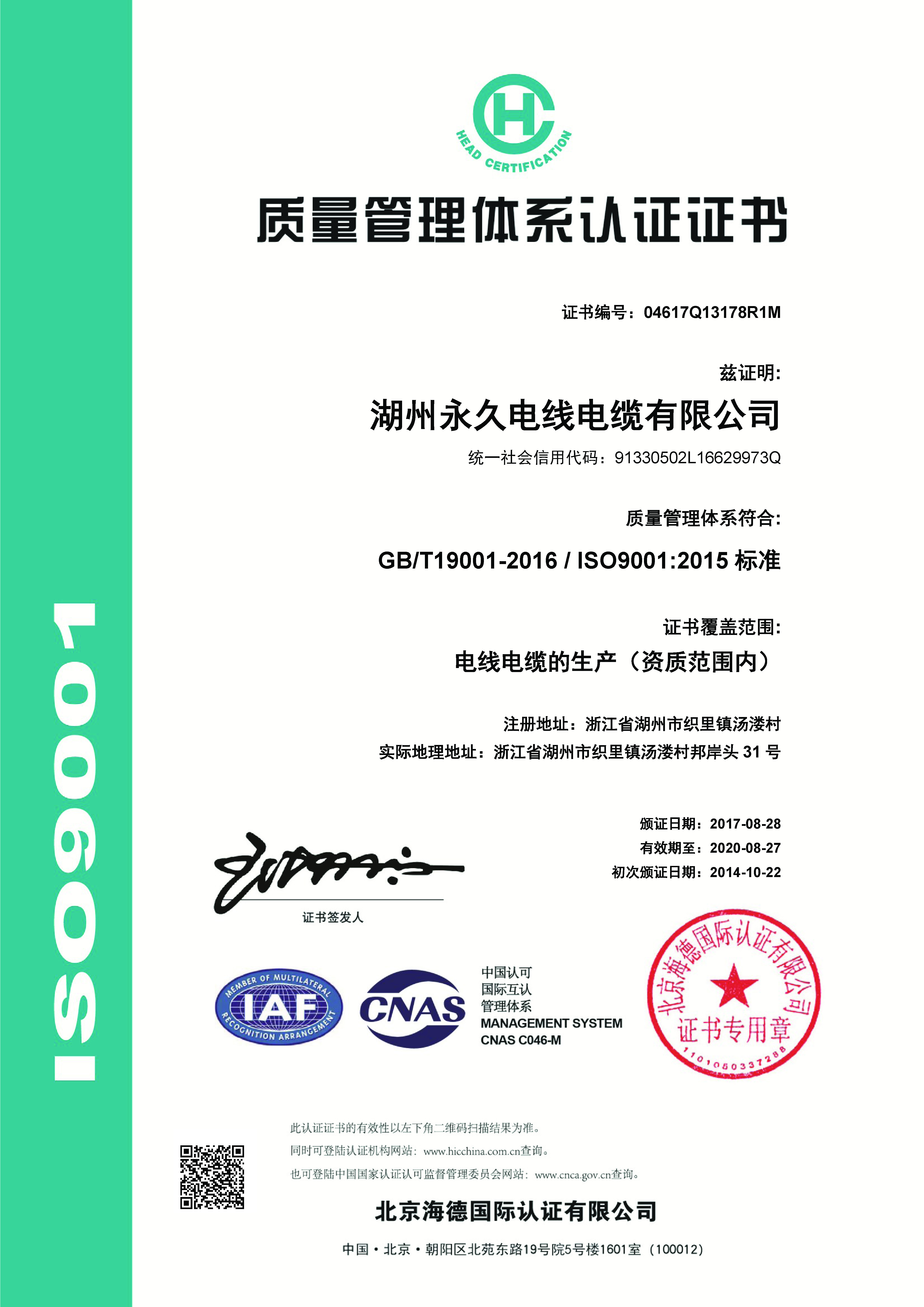 2014年級獲得ISO9001證書, 并獲得湖州名牌產品--“久永” 2015年, “久永”商標獲著名商標的榮譽稱號